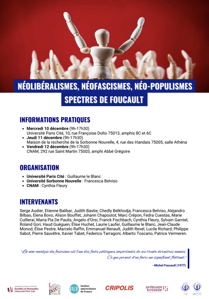 Partout, la logique du marché s’étend. Partout, les populismes autoritaires gagnent du terrain. Entre crise du social, culte du chef et technologies de contrôle, nos démocraties vacillent. Ce colloque explore les liens entre nélibéralisme, néofascisme et néo-populisme dans les formes de gouvernementalités contemporaines. Comment les formes historiques du fascisme ressurgissent-elles dans nos sociétés ? Que devient l’humain dans un monde gouverné par la concurrence et l’exclusion ? Chercheuses et chercheurs internationaux exploreront la vitalité des outils conceptuels de Foucault pour penser un monde où la logique du marché s’étend à toutes les sphères de l’existence.